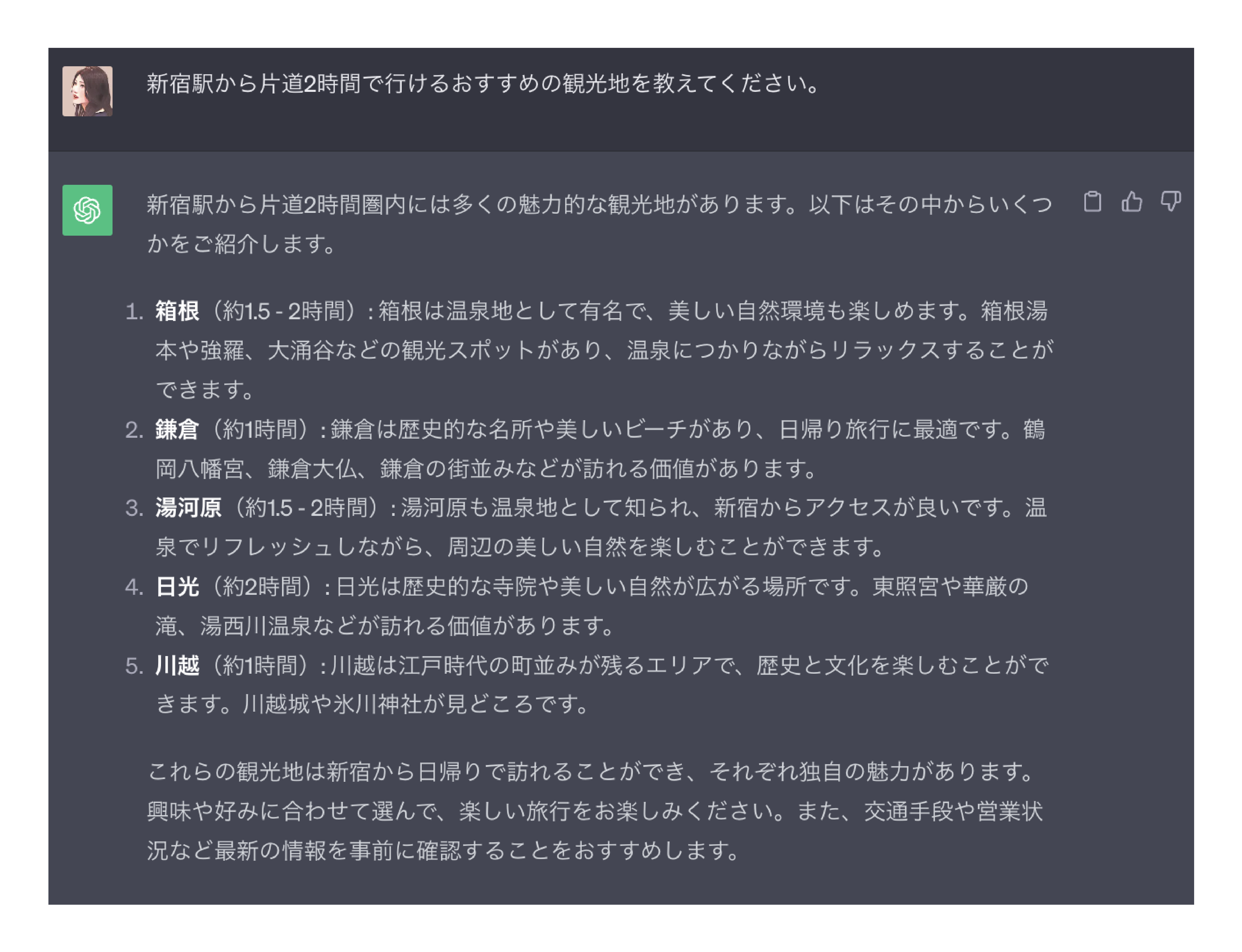 (1)のプロンプトだと範囲が広すぎるため、世界中のおすすめの観光地が提案されます。